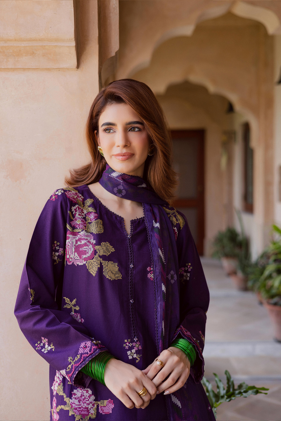 Completing the ensemble is a digitally printed monar dupatta, framed with crochet lace for a touch of artisanal detail. Its vibrant print contrasts beautifully with the embroidered shirt, creating depth, harmony, and an air of modern sophistication.